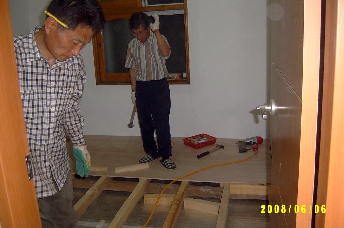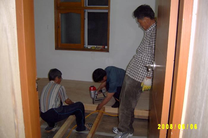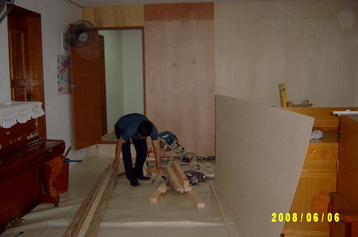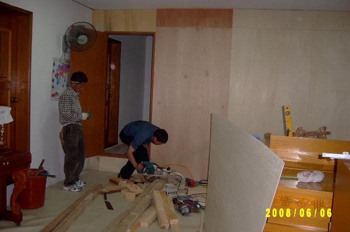 칠암교회 김용규 장로님과 세란병원 김정기 성도님, 그리고 박종진 집사님께서 합심하여 일을 하셨습니다. 이제는 바닥에 전기판넬 설치하는 일과 벽지 바르는 일만 남았습니다.