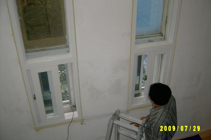 창문과 창문 사이 시멘트공사를 하다